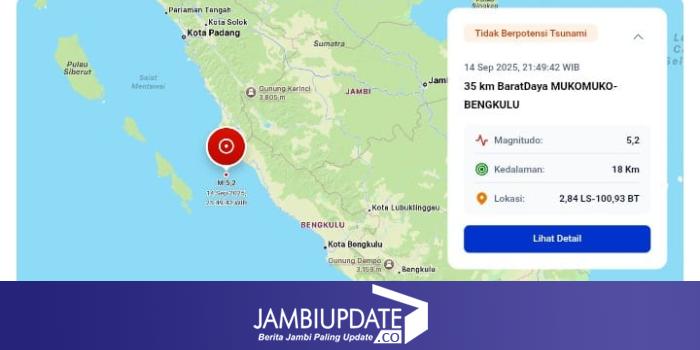 JAMBIUPDATE.CO, KERINCI - Gempa bumi berkekuatan 5,2 SR terjadi di Muko- Muko, Bengkulu 14 Sep 2025, pukul 21:49:42 WIB. Gempa bumi ini terasa kuat hingga di Kerinci dan Kota Sungai Penuh. Hal ini membuat warga keluar rumah saat terjadi gempa. "Gempa, ada gempa," kata warga Kerinci