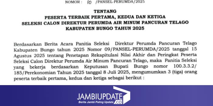 JAMBIUPDATE.CO, MUARA BUNGO – Panitia Seleksi (Pansel) Direktur Perusahaan Umum Daerah (Perumda) Air Minum Pancuran Telago Kabupaten Bungo resmi mengumumkan tiga peserta terbaik hasil seleksi calon direktur tahun 2025.