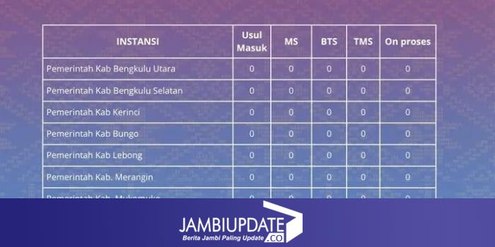 Diketahui ???????????????????????? ???????????????????????????????????? ???????????? ???????????????? ???????????????? ???????????????????? ???????????????????? ????????????????. Data per 20 Oktober 2025, yang terus dipantau dan diperbarui secara berkala untuk memastikan seluruh berkas yang memenuhi syarat dapat segera ditetapkan NIP-nya. Unik Jambi Yan sudah diproses yakni Provinsi Jambi, Sungai Penuh, Sarolangun, Tanjabbarat, Tanjabtim, Kota Jambi, dan Sarolangun. Sedangkan Kerinci, Tebo, Merangin belum masuk usulan NIP di BKN. (Hdp)