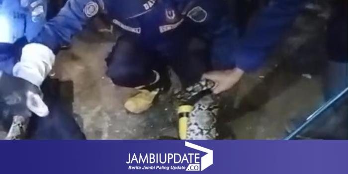 JAMBIUPDATE.CO, MUARO JAMBI - Seekor ular sanca sepanjang sekitar empat meter membuat geger warga RT 08 Desa Mendalo Darat, Kecamatan Jambi Luar Kota, Selasa (13/1/26)malam. Reptil berukuran raksasa itu bersembunyi di plafon sebuah gudang bangunan, memaksa warga meminta bantuan Dinas Pemadam Kebakaran dan Penyelamatan (Damkartan) Kabupaten Muaro Jambi.