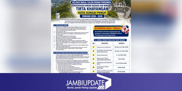 JAMBIUPDATE.CO, SUNGAI PENUH – Pemerintah Kota Sungai Penuh memperpanjang masa pendaftaran seleksi Dewan Pengawas Perumda Tirta Khayangan setelah belum adanya pelamar yang mendaftar sejak dibukanya rekrutmen.