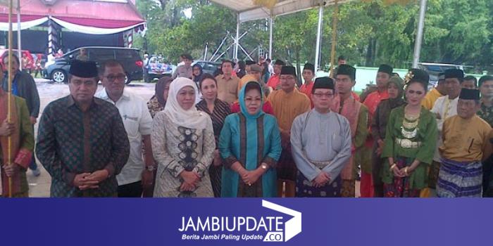 JAMBIUPDATE.COM, JAMBI - Menteri Sosail RI Khofifah Indar Parawansa bersama Gubernur Jambi H. Hasan Basri Agus (HBA) tiba dilokasi HKSN di arena Ex MTQ. Pagi ini Mensos akan membuka pameran Jambi Emas Exspo. Kedatangan Mensos disambut dengan Salokoh adat dan tarian persembahan.