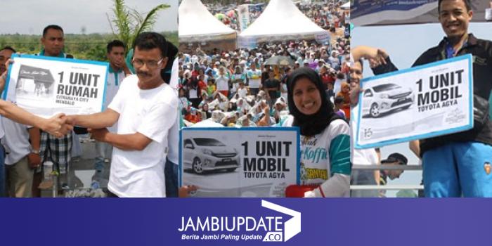 JAMBIUPDATE.COM, JAMBI - Tiga peserta dari 50 ribuan peserta Jalan Santai Jambi Ekspres bersama Luwak White Koffie dalam rangka memeriahkan Hari Ulang Tahun (HUT) yang ke-16 Jambi Ekspres di Kompleks CitraRaya City Mendalo, menjadi peserta yang beruntung mendapatkan hadiah utama berupa satu unit rumah dan dua unit mobil.