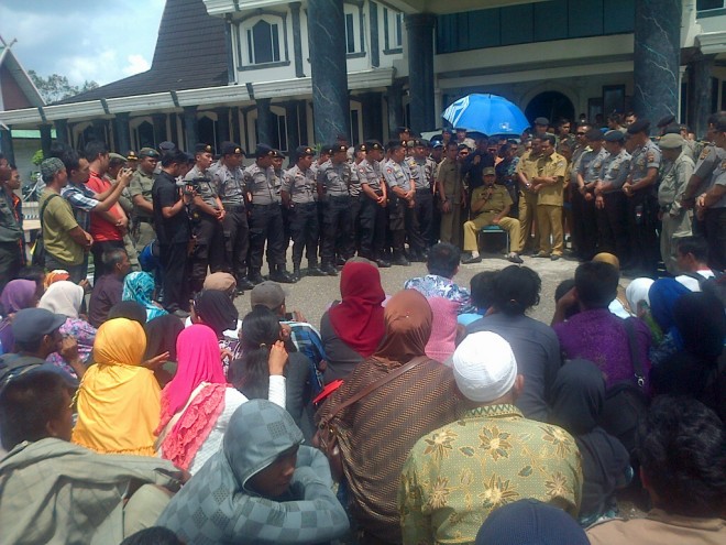JAMBIUPDATE.COM, KUALATUNGKAL - Warga 12 desa yang datang ke kantor bupati tanjung jabung barat pukul 09.00 wib Senin pagi (28/4) kini tengah bertemu bupati. Kedatangan mereka disambut bupati dihalaman kantor bupati.