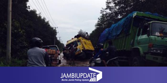 JAMBIUPDATE.COM, MUARASABAK - Rusaknya jalan menuju gapura perbatasan gapura Muarojambi-Tanjabtim mengakibatkan truk PS pengangkut sawit terperosok lobang jalan tersebut. Akibatnya arus kendaraan baik yang menuju Tanjabtim maupun yang menuju Kota Jambi mengular.