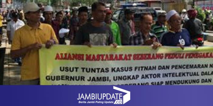 Puluhan masa demo ini meminta pihak Polda Jambi untuk mengusut tuntas kasus penyebaran selebaran gelap yang menghina Gubernur Jambi, Hasan Basri Agus (HBA) dan Isterinya, Yusniana.