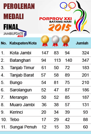 Data yang berhasil diperoleh jambiupdate.com, sampai pukul 21.00 Wib  malam ini (31/5) kotingen ibu kota tersebut unggul jauh dari tuan rumah Batanghari. Kota Jambi sudah mengumpulkan 52 emas, 34 perak dan 25 perunggu sedangkan kontingen tuan rumah baru yang berada di posisi kedua mengumpulkan 28 emas, 29 perak dan 42 perunggu (selengkapnya lihat grafis, red).