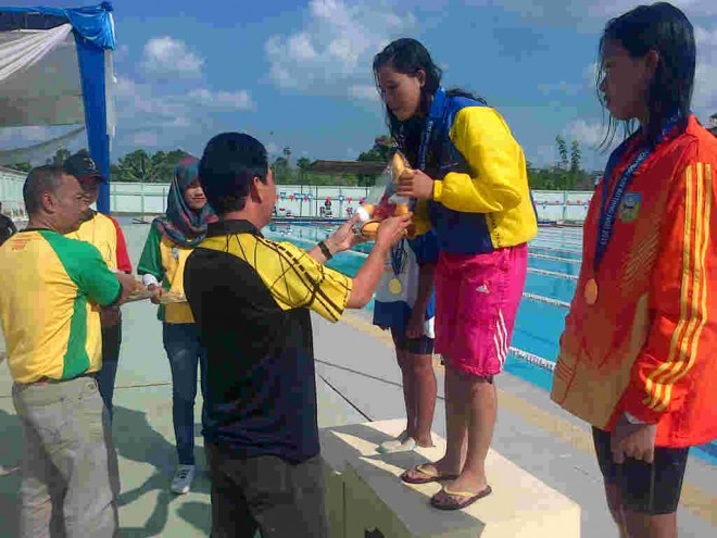 Zadia Salsabilah yang turun di nomor 200 meter gaya bebas putri. Catatan waktu 2 menit 39,03 detik membuatnya keluar sebagai juara dan berhak menerima medali emas.