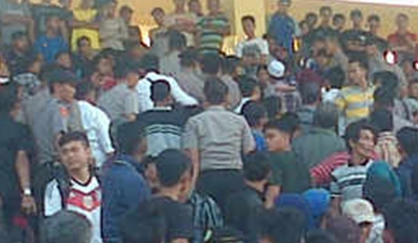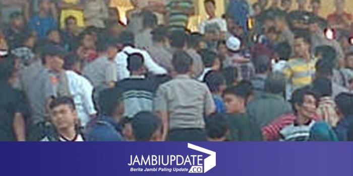 Aksi ini bermula ketika wasit yang dipimpin oleh Sukimindan asisten Wasit Priyanto Valintino serta Hamdan meniupkan pluit bertanda babak pertama usai dilalukan. Namun belum saja keluar lapangan, puluhan botol minuman mineral dilemparkan oleh suporter dari atas Stadion Koni Batanghari.