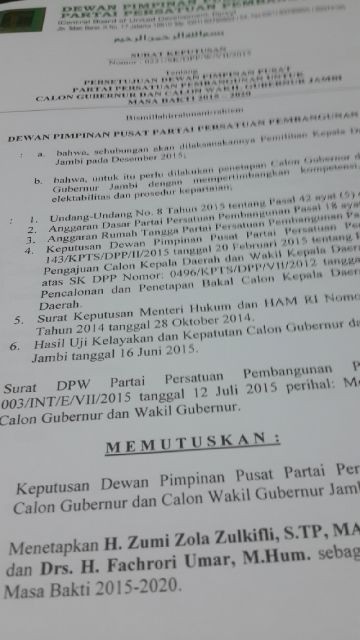 "Alhamdulillah, SK nya sudah turu, PPP siap memenangkan pasangan Zola-Fachrori Umar," ujar Ketua DPW PPP Kubu Romahurmuzy Evi Suherman.