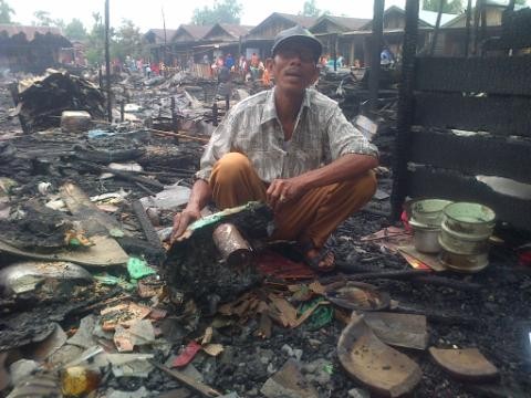 JAMBIUPDATE.COM, KUALATUNGKAL-Sedih, kata-kata itulah yang terlihat diraut salah seorang korban kebakaran saiful anwar. Ia terlihat memunguti sisa kebakaran dirumahnya bersama istri pagi ini (22/8).