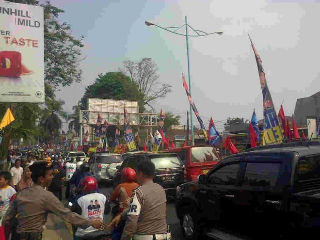 JAMBIUPDATE.COM, JAMBI- Ribuan massa sejak siang ini, Sabtu (22/8) mulai memadati seseon square thehock Kota Jambi untuk menghadiri deklarasi pasangan Hasan Basri Agus (HBA) - Edi Purwanto (EP). Akibatnya, lautan manusia ini seperti semut dan kendaraan seperti mengular.
