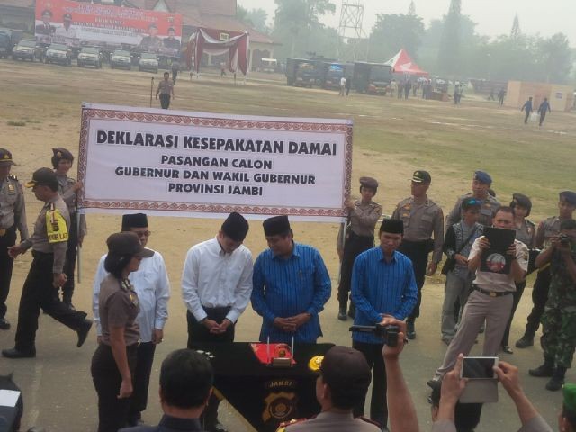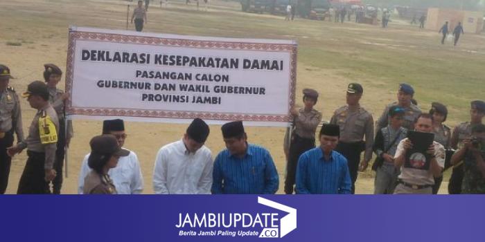 JAMBIUPDATE.COM, JAMBI - Pasangan Calon Gubernur dan Wakil Gubernur Jambi, HBA - Edi dan Zumi Zola - Fachrori, Rabu (27/8) menandatangi kesepakatan damai dalam pemilihan Gubernur dan Wakil Gubernur 9 Desember mendatang. Deklarasi dilakukan di Eks Arena MTQ Kota Jambi.