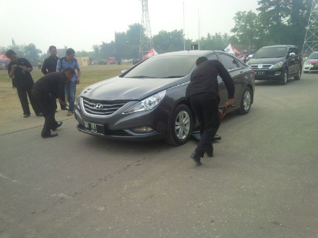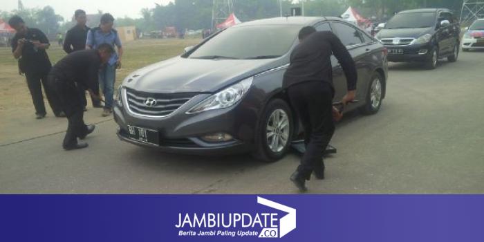 JAMBIUPDATE.COM, JAMBI - Satu unit mobil di Eks Arena MTQ, Kota Jambi, Rabu (26/8) mendadak diperiksa anggota polisi dengan alat deteksi Mirror Set. Dua orang mengelilingi mobil dengan alat tersebut.