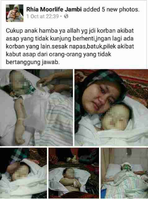 JAMBIUPDATE.COM, JAMBI Seorang balita di Kota Jambi, diduga meninggal akibat kabut asap. Berita duka ini diketahui dari postingan pemilik akun Facebook Rhia Moorlife Jambi yang diduga ibu kandung korban.