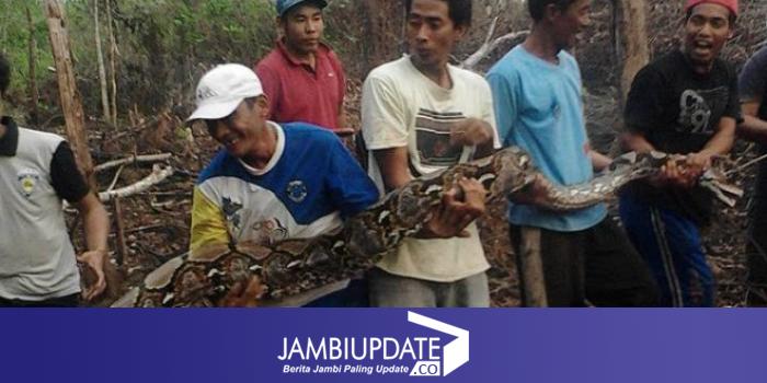 MUARABULIAN-Warga RT 19 Kelurahan Teratai, Kecamatan Muarabulian, Kabupaten Batanghari Kamis (5/11) dikejutkan dengan penemuan seekor ular piton raksasa sepanjang 8 meter. Ular tersebut ditemukan oleh Sobar saat tengah asik membersihkan kebun.