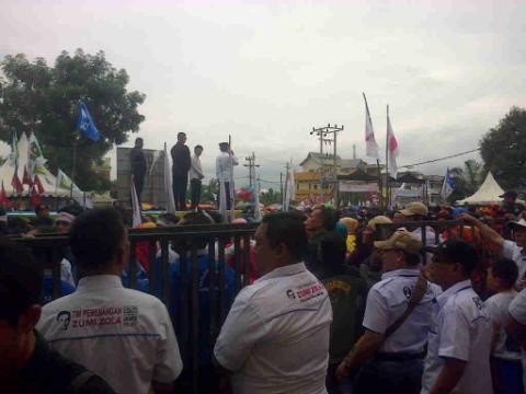 JAMBIUPDATE.CO, JAMBI-Meski diguyur hujan, puluhan ribu massa pendukung pasangan calon gubernur dan wakil gubernur Jambi nomor urut 2 Zumi Zola-Fachrori Umar tetap memadati halaman parkir stadion Koni Provinsi Jambi, yang terletak untuk mengikuti kampanye akbar pasangan nomor urut 2 Zumi Zola Zulkifli-Fachrori Umar, Minggu (29/11) siang.