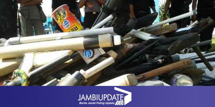 JAMBIUPDATE.CO, JAMBI - Puluhan Senjata Api (Senpi) rakita jenis kecepek milik Warga Suku Anak Dalam (SAD) diamankan pihak kepolisian bersama dengan unsur TNI di Desa Singoan, Kabupaten Batanghari Minggu (20/12) siang. Ini dilakukan untuk mengantisipasi terjadinya konflik.