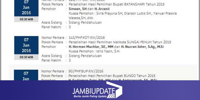 Berdasarkan informasi yang dikutip dari situs http://www.mahkamahkonstitusi.go.id, untuk Nomor Perkara 124/PHP.BUP-XIV/2016, Pokok Perkara Perselisihan Hasil Pemilihan Bupati Batanghari Tahun 2015, dengan Pemohon Sinwan, SH dan H. Arzanil, Kuasa Pemohon : Sirra Prayuna SH, Diarson Lubis SH., Yanuar Prawira Wasesa,SH, dkk, Pendahuluan Panel Hakim 3 dengan jadwal persidangan pada 7 Januari 2016 pukul 08:30 WIB.