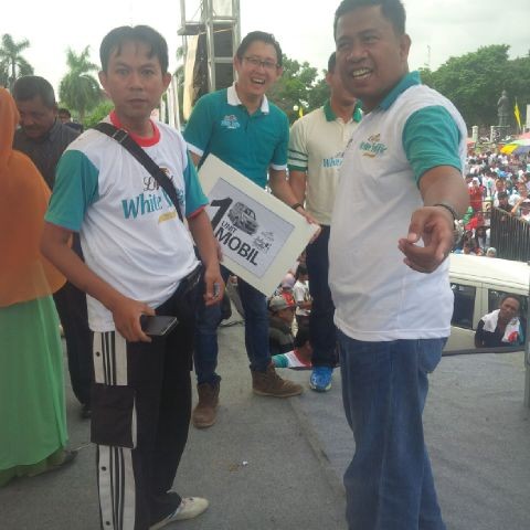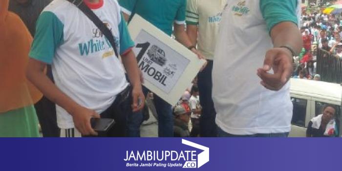 JAMBIUPDATE.CO, JAMBI - Raut wajah Yung Wei, terlihat gembira setelah namanya dipanggil MC acara Jalan Santai Jambi Ekspres, Minggu (28/2). Warga Panca Karya, Kota Jambi, ini mendapatkan hadiah satu unit mobil.
