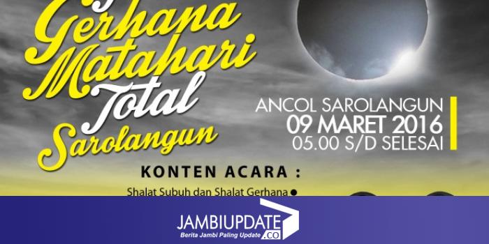 JAMBIUPDATE.CO, JAMBI-Menyaksikan Gerhana Matahari dari Kabupaten Sarolangun pasti akan lebih maksimal, karena di Sarolangun Gerhana akan terlihat lebih total. Pemerintah Kabupaten Sarolangun juga telah bersiap dan memanfatkan momen ini dengan berbagai kegiatan, tujuannya agar tingkat kunjungan ke Kabupaten Sarolangun meningkat tajam pas hari H, Rabu 9 Maret 2016.