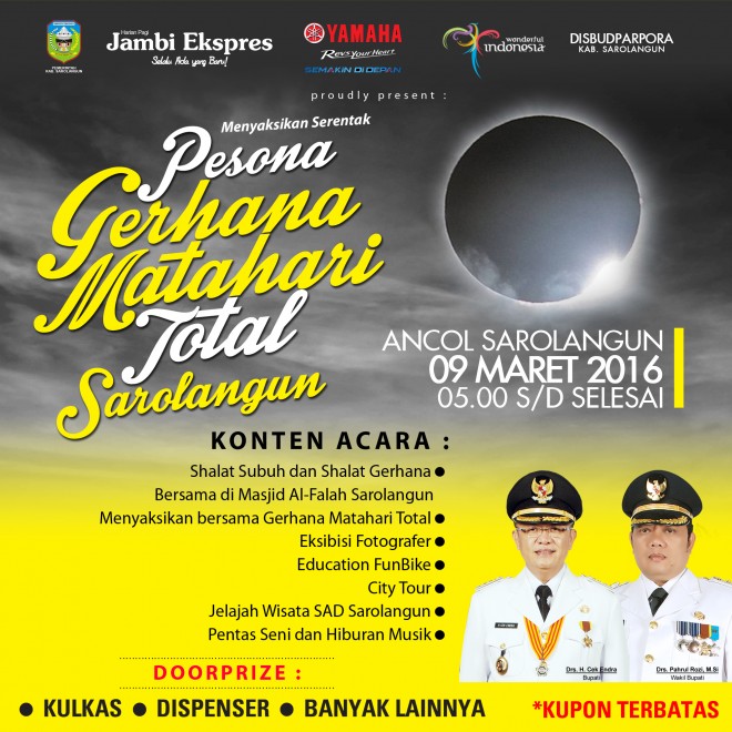 Kita juga disupport oleh Jambi Ekspres dan Yamaha, akan ada kupon undian dengan hadiah hiburan nantinya untuk massa yang hadir, kita harap masyarakat akan lebih ramai datang dan berkunjung ke Sarolangun agar bisa menyaksikan Gerhana Matahari Total dengan lebih maksimal, lanjutnya.