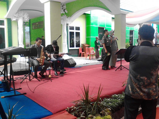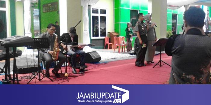 JAMBIUPDATE.CO, JAMBI - Mayor Jendral Purwadi Mukson didamping istri menyempatkan diri untuk persembahkan sebuah lagu pada acara peresmian Gedung Kantor Denpom II/2 Jambi Senin (14/3).
