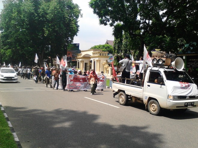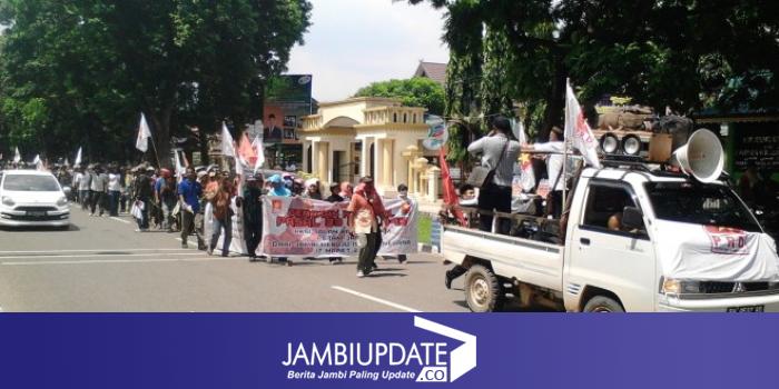 JAMBIUPDATE.CO, JAMBI - Ratusan Petani Jambi menggelar aksi jalan kaki 1000 KM dalam rangka Gerakan Nasional Pasal 33 UU 1945, Kamis (17/3).