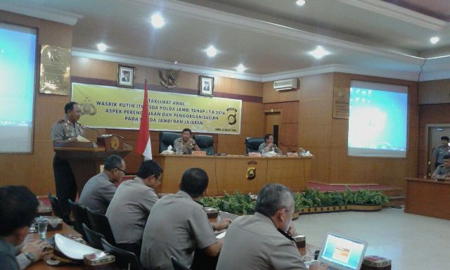 JAMBIUPDATE.CO, JAMBI Kepolisian Daerah (Polda) Jambi, saat ini tengah melaksanakan taklimat awal Wasrik (Pengawasan dan Pemeriksaan) rutin tahap I secara internal Polda Jambi hingga ke Polres jajaran pada bidang perencanaan dan pengorganisasian. Kegiatan pemeriksaan internal ini dibuka langsung oleh Kapolda Jambi, Brigjen Pol Musyafak, Selasa (22/3) sekitar pukul 08.00 WIB.