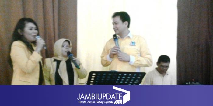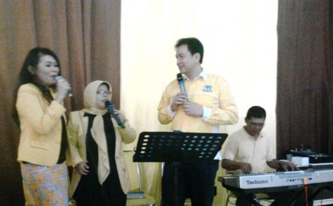 Tanpa canggung-canggung Aziz membawakan tembang dangdut yang berjudul  "Tidak semua laki-laki" yang di dampingi kader Partai Golkar Jambi.
