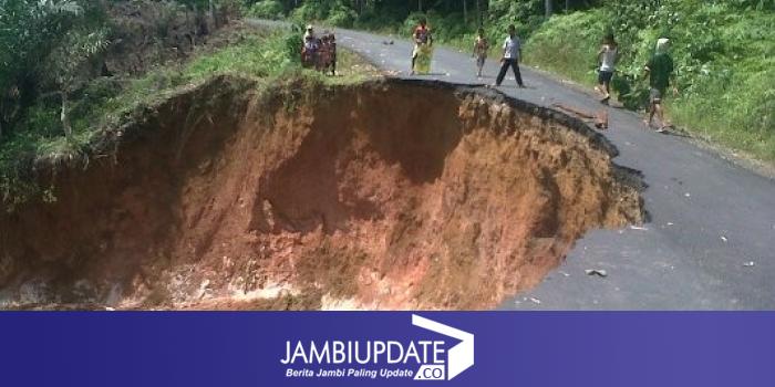 JAMBIUPDATE.CO, MUARATEBO - Jalan penghubung antar desa yang berada di Desa Sungai Alai, Kacamatan Tebo Tengah, Kabupaten Tebo, nyaris putus akibat longsor yang terjadi beberapa hari lalu.