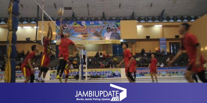 JAMBIUPDATE.CO, JAMBI - Tim Putra Polres Merangin pastikan tiket terakhir perdelapan final turnamen Bola Voli Kapolda Cup 2016, Kamis (14/4). Tiket ini diraih setelah tim Merangin Sakti (julukan Polres Merangin, red) mengalahkan Bungo pada babak penyisihan grup yang bertempat di GOR Kotabaru Jambi.