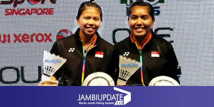 JAMBIUPDATE.CO, SINGAPURA - Pasangan ganda putri Indonesia Greysia Polii/Nitya Krishinda Maheswari meraih titel juara Singapore Open Super Series 2106. Mereka menjadi juara tanpa harus memeras keringat di Singapore Indoor Stadium, Minggu (17/4).