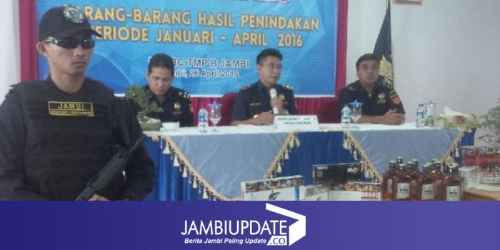 Kantor Pengawasan dan Pelayanan Bea dan Cukai Tipe Madya Pabean B Jambi menggelar jumpa pers Selasa (26/4) setelah berhasil mengmankan barang ilegal. (F/DONI/JU)