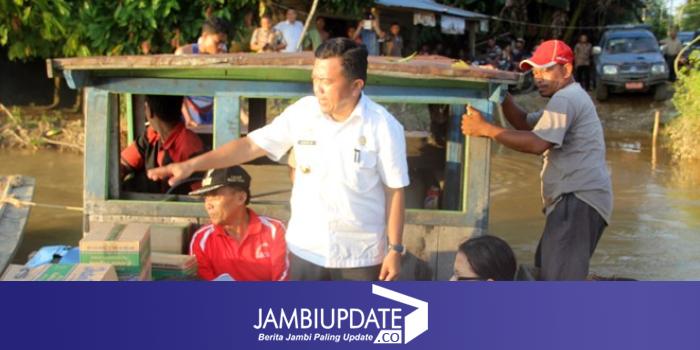 Orang nomor satu di Pemkab Merangin ini pun terpaksa menggunakan perahu untuk sampai ke kawasan yang di landa banjir unutk memberikan bantuan kepada korban banjir di Desa Sungai Limau Kecamatan Tabir Timur