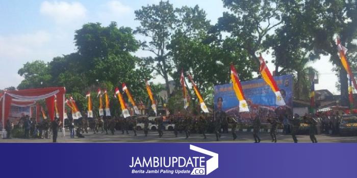 JAMBIUPDATE.CO, JAMBI - 65 personel Detasemen B Pelopor Pamenang tunjukkan aksi memukau dalam atraksi usai upacara pembinaan Tradisi Bhayangkara ke 70 di Mapolda Jambi.