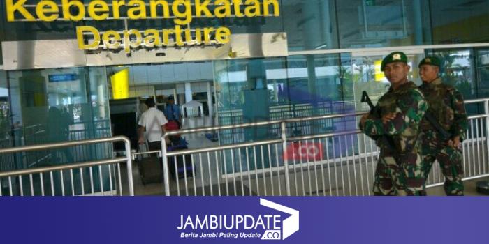 JAMBIUPDATE.CO, JAMBI - Penjagaan ketat dilakukan anggota TNI di Bandara Sultan Thaha Jambi. Penjagaan dilakukan dari anggota Batalyon 142/Ksatria Jaya.