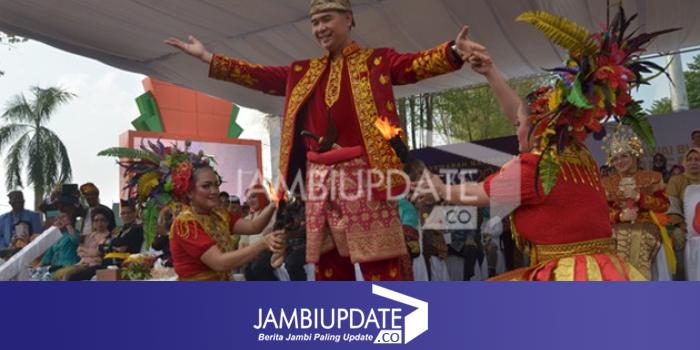 JAMBUPDATE.CO, JAMBI Aksi menarik ditunjukkan Walikota Jambi, Sy Fasha, saat pelaksanaan Pawai Budaya Nusantara dalam rangkaian acara Munas V APEKSI di Kota Jambi, Rabu (27/7).
