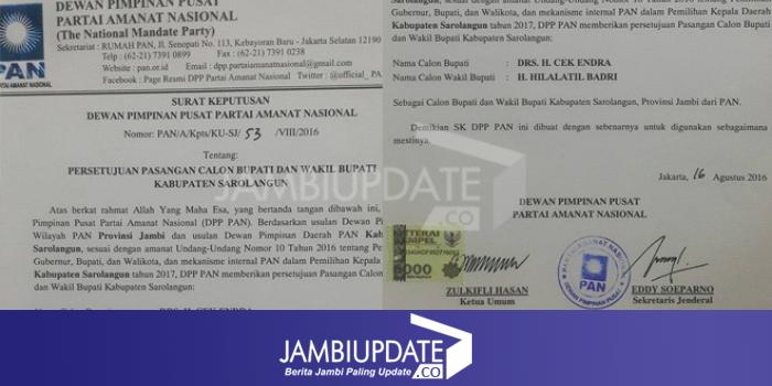 Berdasarkan kopian surat rekomendasi yang diperoleh jambiupdate.co, surat bernomor PAN/Kpts/KU-SJ/53/VIII/2016 itu tentang persetujuan pasangan calon bupati dan wakil bupati Kabupaten Sarolangun,