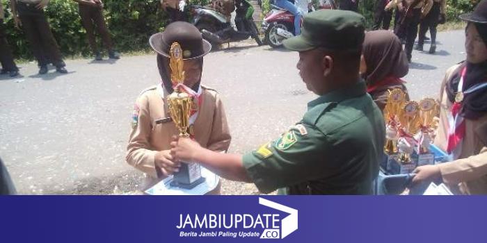 Anggota Babinsa saat menyerahkan pemenang lomba gerak jalan pramuka se Kecamatan Danau Teluk.