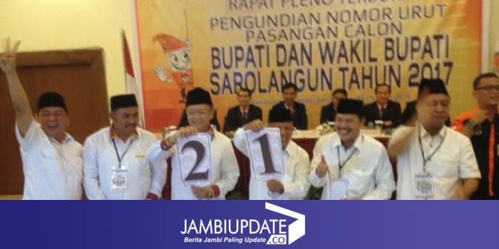 Dari pantauan Jambiupdate.co, Pasangan H Muhammad Madel-Musharsyah mendapatkan nomor urut 1. Sementara pasangan H Cek Endra-Musharsyah mendapatkan nomor urut 2.