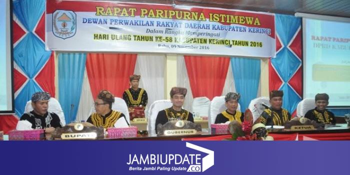 JAMBIUPDATE.CO, JAMBI - Rapat Paripurna istemewa DPRD Kabupaten Kerinci dalam rangka Peringatan hari jadi Kabupaten Kerinci yang 58 tahun 2016, berlangsung khitmad.