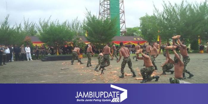 JAMBIUPDATE.CO, JAMBI - Hari Ulang Tahun (HUT) Korps Brimob, Senin (14/11) dimeriahkan dengan aksi personel Brimobda Jambi. Mereka menampilkan berbagai bela diri.