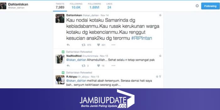 "Kau nodai kotaku Samarinda denga kebiadabanmu. Kau rusak kerukunan warga kotaku dengan kebencianmu. Kau renggut kesucian anak-anakku dengan terormu #RIPIntan," tulis Dahlan Iskan di akun @iskan_dahlan.