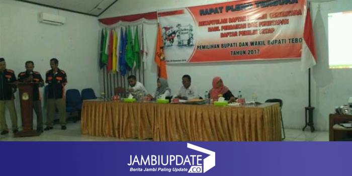 Dalam pleno tersebut ditetapkanlah Daftar Pemilih Tetap (DPT) Pilkada Tebo 2017 sebanyak 220.242, yang terdiri dari 122.137 laki-laki dan 108.105 perempuan.
