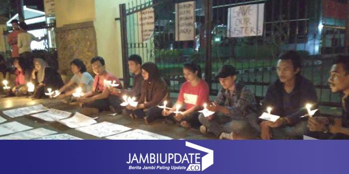 JAMBIUPDATE.CO, JAMBI - Puluhan masa yang mengatasnamanakan Save Our Sisters yang terdiri dari Akademisi, LSM, Ormas, Mahasiswa, Anak-anak, menggelar aksi menyalakan lilin di depan Kantor Kejaksaan Negeri Jambi, Malam ini (10/12).