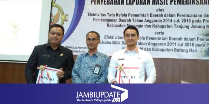 JAMBIUPDATE.CO, JAMBI - Pemerintah Provinsi Jambi dan 4 Pemerintah Kabupaten se Provinsi Jambi, menerima Laporan Hasil Pemeriksaan (LHP) Kinerja atas Efektivitas Tata Kelola Pemerintahan Daerah dalam Perencanaan dan Penganggaran Pembangunan Daerah (Renbangda) TA 2014 s.d. 2016 serta Efektivitas Tata Kelola Pemerintahan Daerah dalam Pembinaan BUMD TA 2011 s.d 2016, dari Badan Pemeriksa Keuangan Republik Indonesia (BPK RI) Perwakilan Jambi, Rabu (14/12).