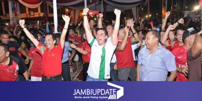 JAMBIUPDATE.CO, JAMBI - Ratusan masyarakat Jambi memadati halaman kantor Gubernur Jambi, Rabu (14/12) malam. Ini dalam rangka memeriahkan nonton bareng bersama Gubernur Jambi pada laga final AFF 2016 Timnas Indonesia Vs Thailand.