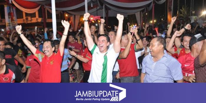 JAMBIUPDATE.CO, JAMBI - Ratusan masyarakat Jambi, Rabu (14/12) malam. Memeriahkan nonton bareng bersama Gubernur Jambi pada laga final AFF 2016 Timnas Indonesia Vs Thailand.