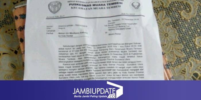 JAMBIUPDATE.CO, BATANGHARI- Beberapa waktu yang lalu Kabupaten Batanghari dihebohkan dengan pemberitaan di media cetak maupun media online tentang keberangkatan 2 dokter Puskesmas Muara Tembesi, Kamis (15/12/2016), membawa jenazah ke Pematang Siantar Sumatera Utara, tanpa izin dari Dinas Kesehatan serta Pemkab Batang Hari, mendapat bantahan oleh Kepala Puskesmas Muara Tembesi, dr. Bebi Andihara.
